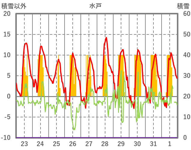 | 日 | 時 | 気温 | 降水 | 風向/風速 | 日照 | 積雪 | 降雪 |