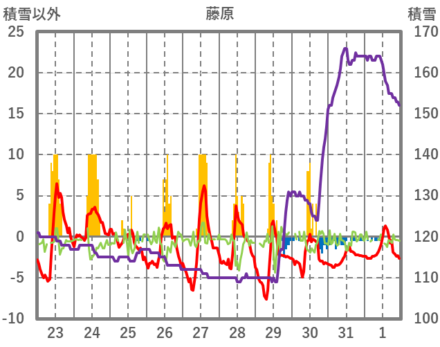 | 日 | 時 | 気温 | 降水 | 風向/風速 | 日照 | 積雪 | 降雪 |