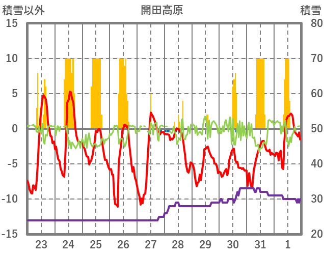 | 日 | 時 | 気温 | 降水 | 風向/風速 | 日照 | 積雪 | 降雪 |