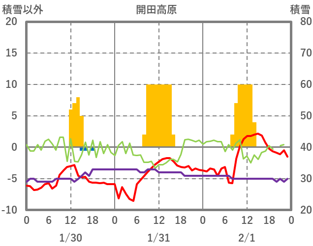 | 日 | 時 | 気温 | 降水 | 風向/風速 | 日照 | 積雪 | 降雪 |