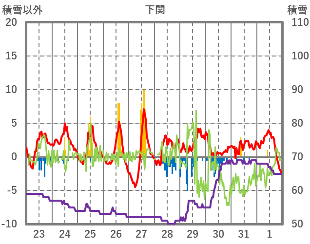 | 日 | 時 | 気温 | 降水 | 風向/風速 | 日照 | 積雪 | 降雪 |