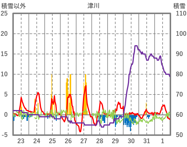 | 日 | 時 | 気温 | 降水 | 風向/風速 | 日照 | 積雪 | 降雪 |