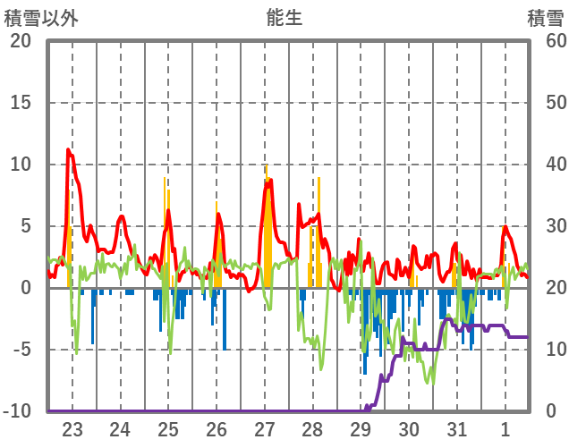 | 日 | 時 | 気温 | 降水 | 風向/風速 | 日照 | 積雪 | 降雪 |
