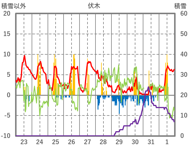 | 日 | 時 | 気温 | 降水 | 風向/風速 | 日照 | 積雪 | 降雪 |
