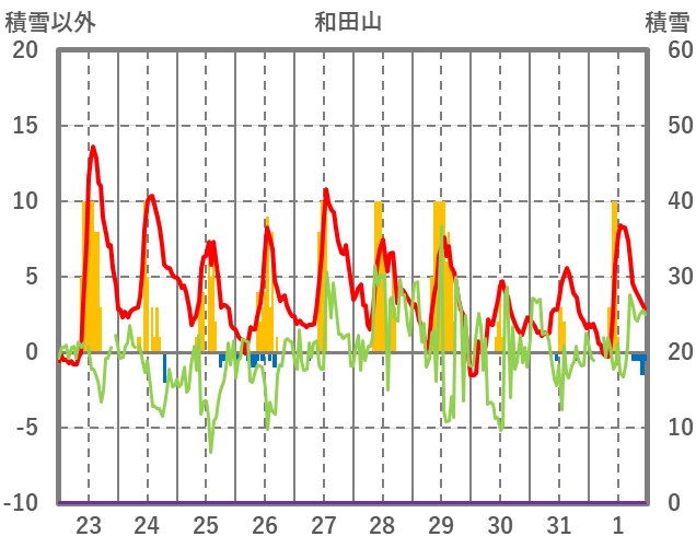 | 日 | 時 | 気温 | 降水 | 風向/風速 | 日照 | 積雪 | 降雪 |