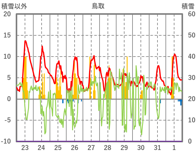 | 日 | 時 | 気温 | 降水 | 風向/風速 | 日照 | 積雪 | 降雪 |