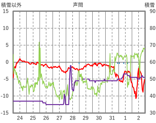 | 日 | 時 | 気温 | 降水 | 風向/風速 | 日照 | 積雪 | 降雪 |