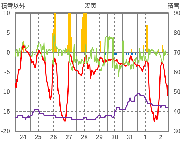 | 日 | 時 | 気温 | 降水 | 風向/風速 | 日照 | 積雪 | 降雪 |