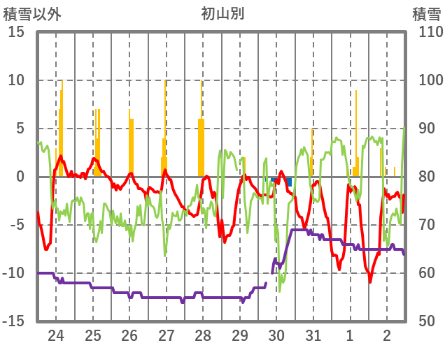 | 日 | 時 | 気温 | 降水 | 風向/風速 | 日照 | 積雪 | 降雪 |