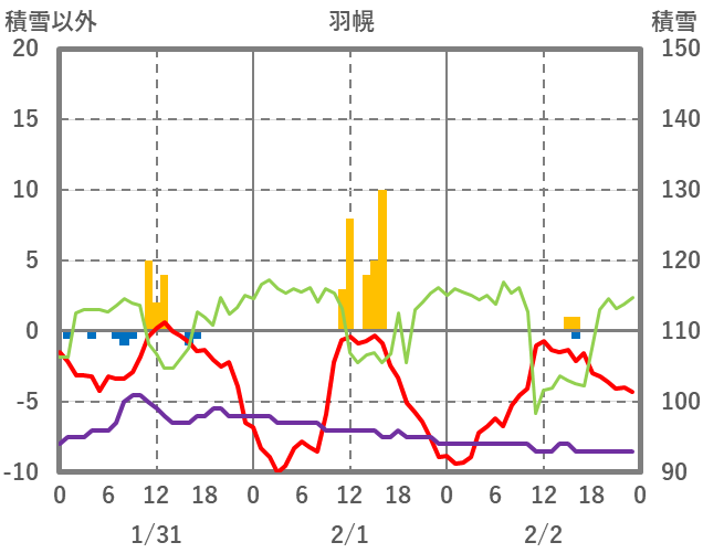 | 日 | 時 | 気温 | 降水 | 風向/風速 | 日照 | 積雪 | 降雪 |