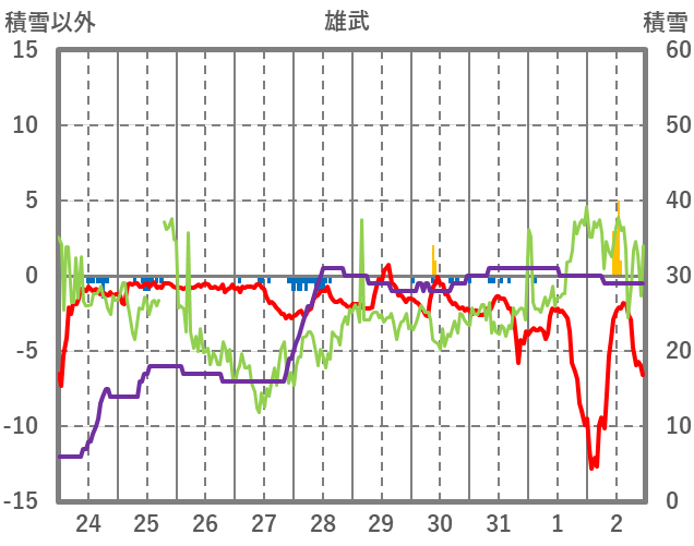 | 日 | 時 | 気温 | 降水 | 風向/風速 | 日照 | 積雪 | 降雪 |