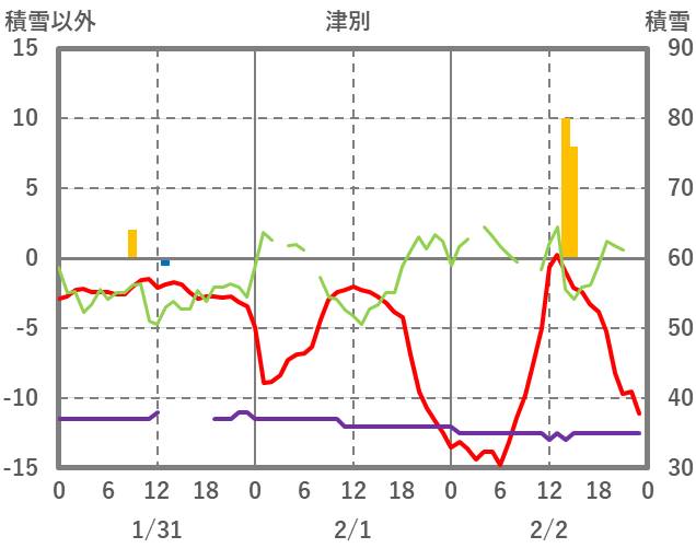 | 日 | 時 | 気温 | 降水 | 風向/風速 | 日照 | 積雪 | 降雪 |