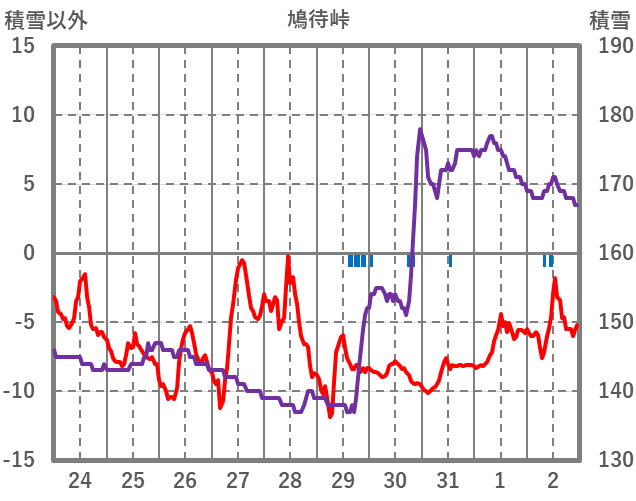 | 日 | 時 | 気温 | 降水 | 風向/風速 | 日照 | 積雪 | 降雪 |