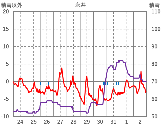 | 日 | 時 | 気温 | 降水 | 風向/風速 | 日照 | 積雪 | 降雪 |