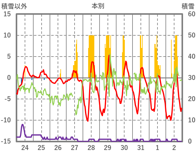 | 日 | 時 | 気温 | 降水 | 風向/風速 | 日照 | 積雪 | 降雪 |