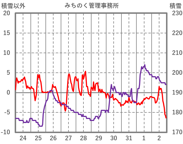 | 日 | 時 | 気温 | 降水 | 風向/風速 | 日照 | 積雪 | 降雪 |