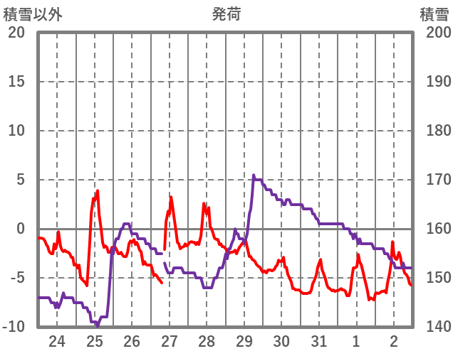 | 日 | 時 | 気温 | 降水 | 風向/風速 | 日照 | 積雪 | 降雪 |