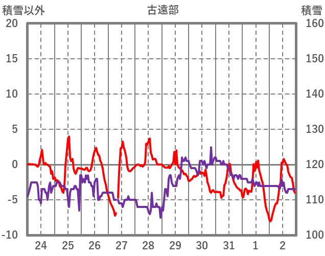| 日 | 時 | 気温 | 降水 | 風向/風速 | 日照 | 積雪 | 降雪 |