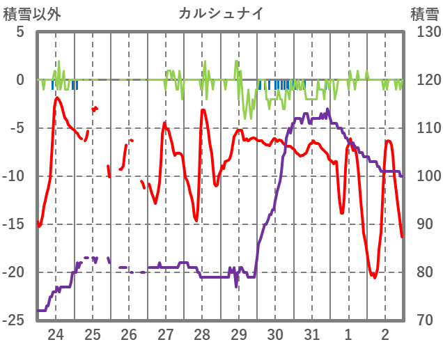 | 日 | 時 | 気温 | 降水 | 風向/風速 | 日照 | 積雪 | 降雪 |