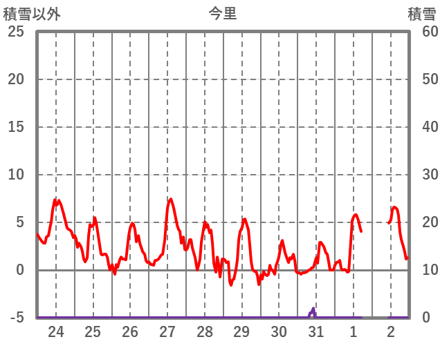 | 日 | 時 | 気温 | 降水 | 風向/風速 | 日照 | 積雪 | 降雪 |