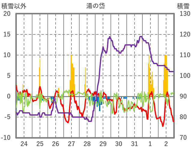 | 日 | 時 | 気温 | 降水 | 風向/風速 | 日照 | 積雪 | 降雪 |