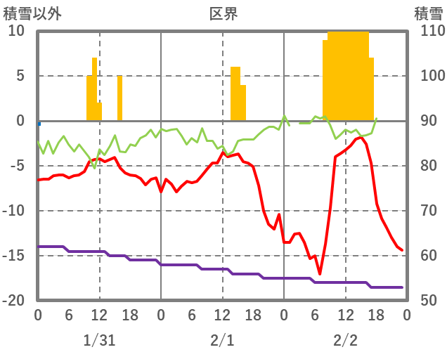 | 日 | 時 | 気温 | 降水 | 風向/風速 | 日照 | 積雪 | 降雪 |