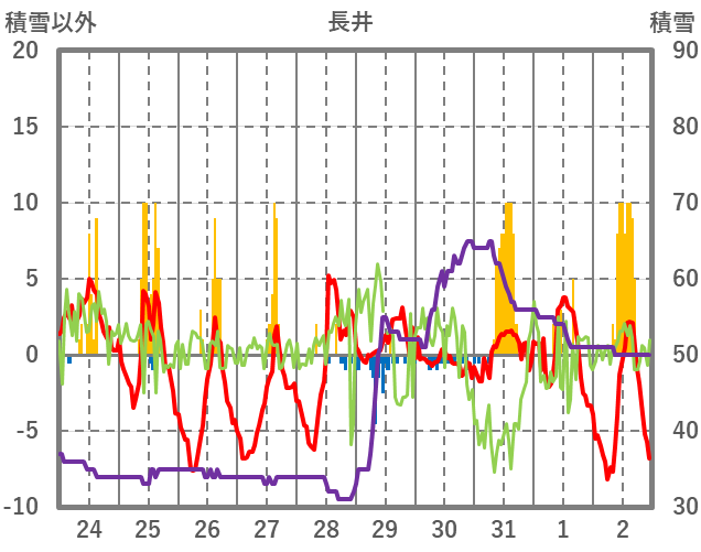 | 日 | 時 | 気温 | 降水 | 風向/風速 | 日照 | 積雪 | 降雪 |