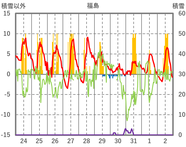 | 日 | 時 | 気温 | 降水 | 風向/風速 | 日照 | 積雪 | 降雪 |