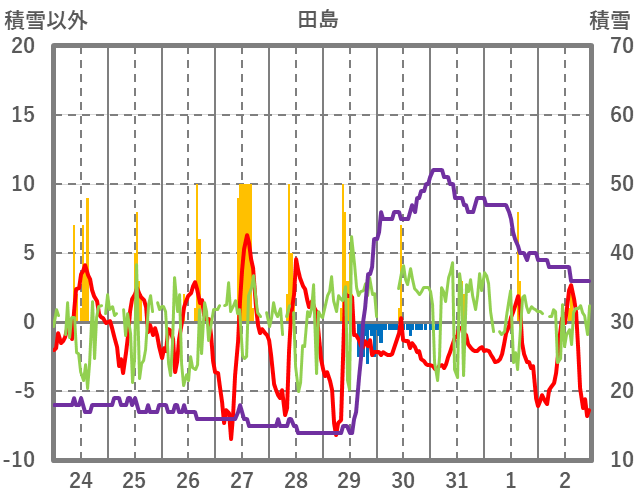 | 日 | 時 | 気温 | 降水 | 風向/風速 | 日照 | 積雪 | 降雪 |
