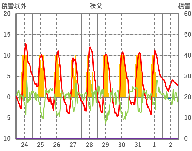 | 日 | 時 | 気温 | 降水 | 風向/風速 | 日照 | 積雪 | 降雪 |