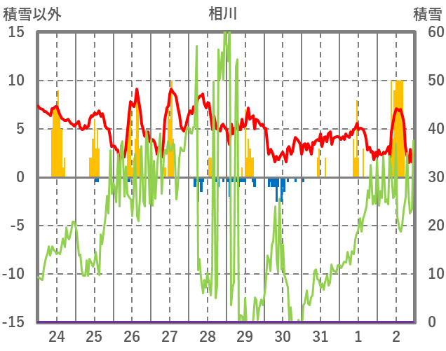 | 日 | 時 | 気温 | 降水 | 風向/風速 | 日照 | 積雪 | 降雪 |