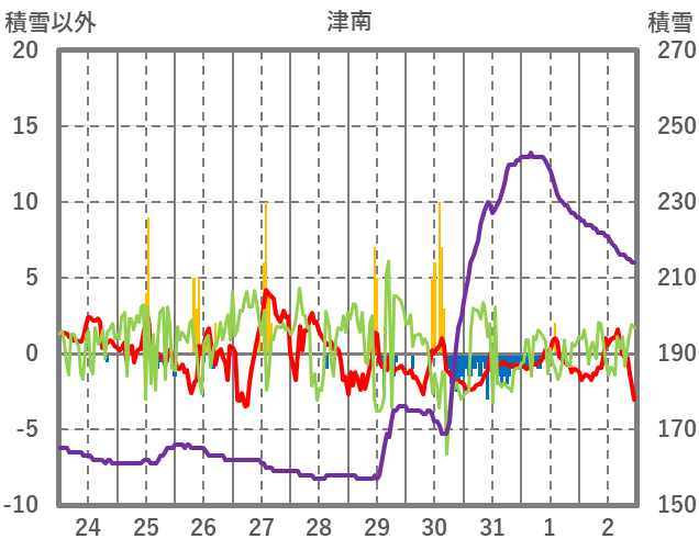 | 日 | 時 | 気温 | 降水 | 風向/風速 | 日照 | 積雪 | 降雪 |