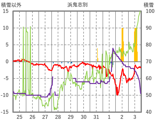 | 日 | 時 | 気温 | 降水 | 風向/風速 | 日照 | 積雪 | 降雪 |