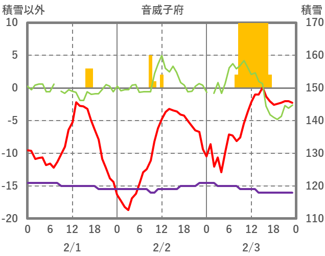 | 日 | 時 | 気温 | 降水 | 風向/風速 | 日照 | 積雪 | 降雪 |