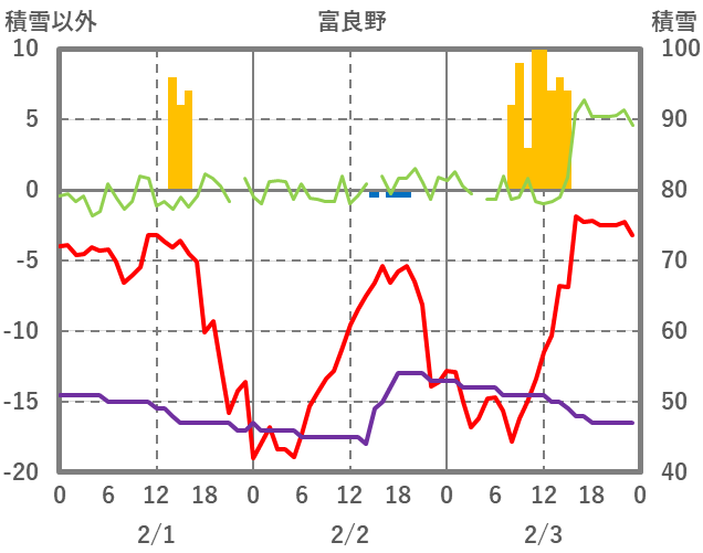 | 日 | 時 | 気温 | 降水 | 風向/風速 | 日照 | 積雪 | 降雪 |