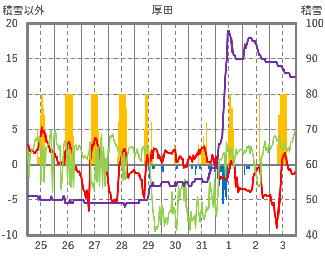 | 日 | 時 | 気温 | 降水 | 風向/風速 | 日照 | 積雪 | 降雪 |