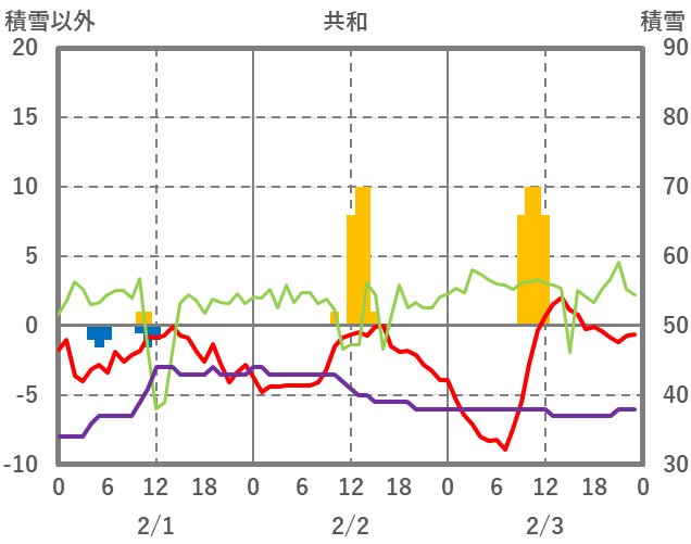 | 日 | 時 | 気温 | 降水 | 風向/風速 | 日照 | 積雪 | 降雪 |
