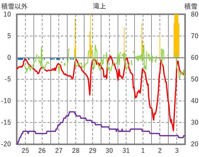 | 日 | 時 | 気温 | 降水 | 風向/風速 | 日照 | 積雪 | 降雪 |