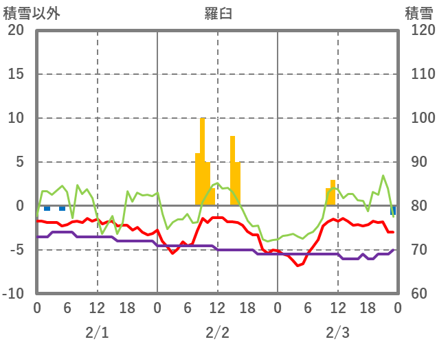 | 日 | 時 | 気温 | 降水 | 風向/風速 | 日照 | 積雪 | 降雪 |