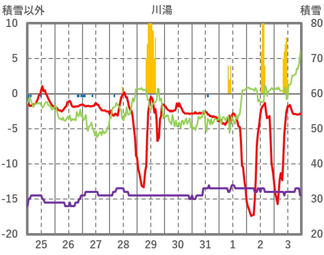 | 日 | 時 | 気温 | 降水 | 風向/風速 | 日照 | 積雪 | 降雪 |