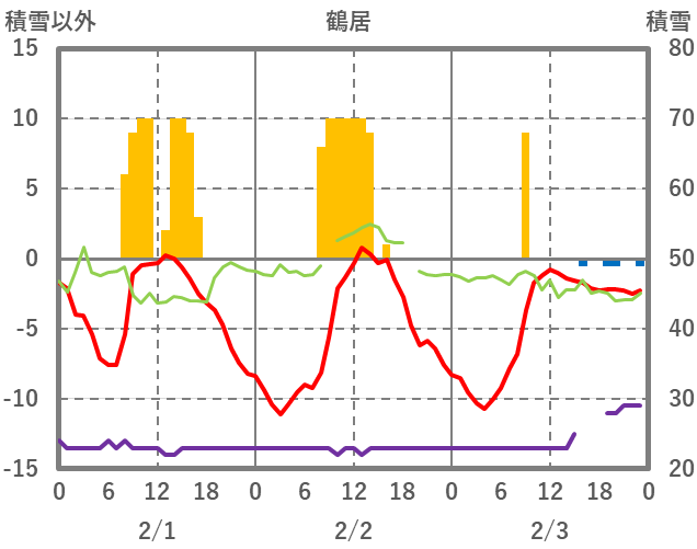 | 日 | 時 | 気温 | 降水 | 風向/風速 | 日照 | 積雪 | 降雪 |