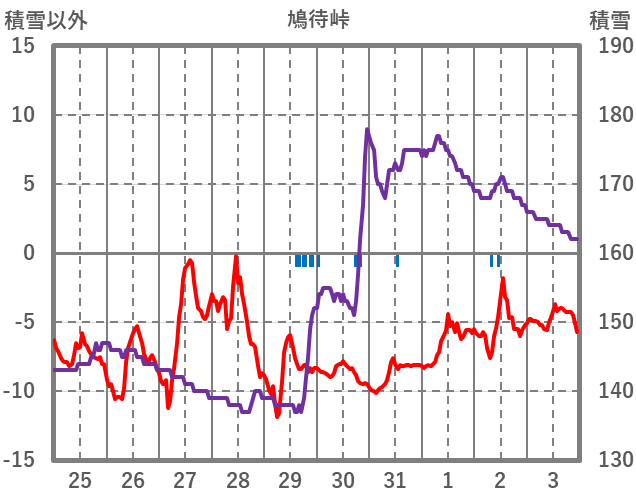 | 日 | 時 | 気温 | 降水 | 風向/風速 | 日照 | 積雪 | 降雪 |