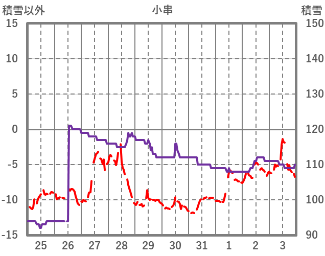 | 日 | 時 | 気温 | 降水 | 風向/風速 | 日照 | 積雪 | 降雪 |