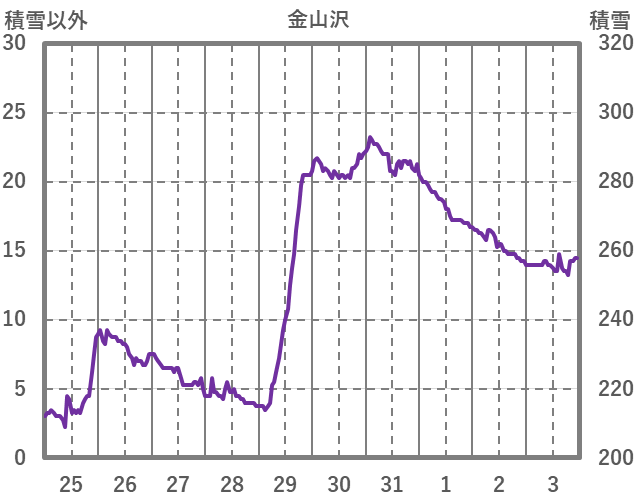 | 日 | 時 | 気温 | 降水 | 風向/風速 | 日照 | 積雪 | 降雪 |