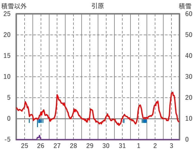 | 日 | 時 | 気温 | 降水 | 風向/風速 | 日照 | 積雪 | 降雪 |