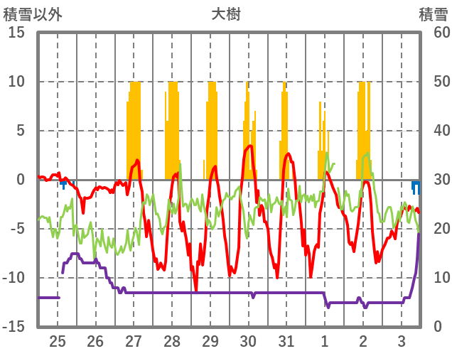 | 日 | 時 | 気温 | 降水 | 風向/風速 | 日照 | 積雪 | 降雪 |