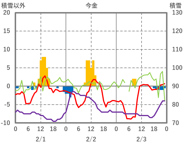 | 日 | 時 | 気温 | 降水 | 風向/風速 | 日照 | 積雪 | 降雪 |