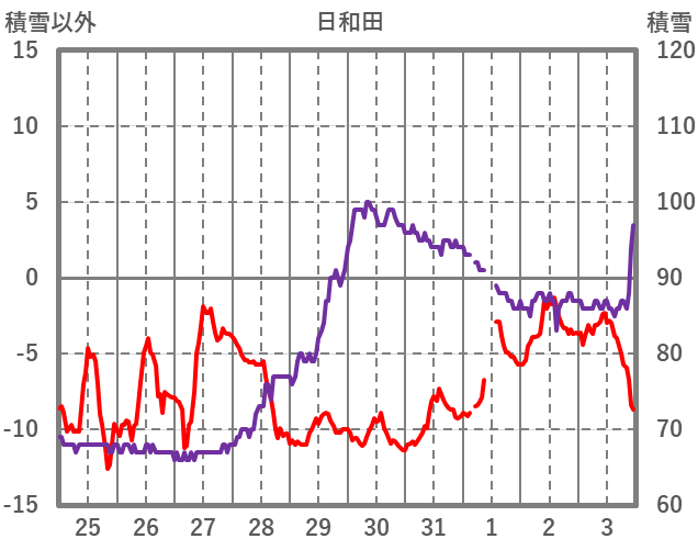 | 日 | 時 | 気温 | 降水 | 風向/風速 | 日照 | 積雪 | 降雪 |