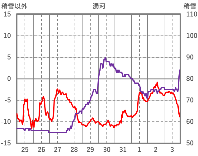 | 日 | 時 | 気温 | 降水 | 風向/風速 | 日照 | 積雪 | 降雪 |