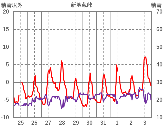 | 日 | 時 | 気温 | 降水 | 風向/風速 | 日照 | 積雪 | 降雪 |